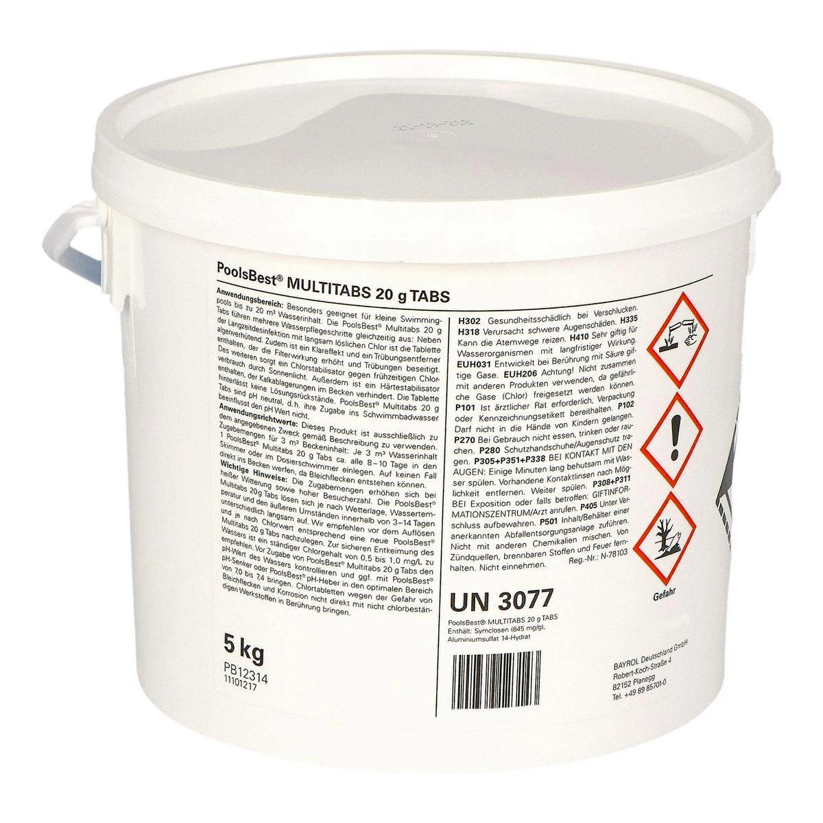 PoolsBest® Mini Multitabs 20g Tabs, aus organischem Chlor, sind die komplette Schwimmbadpflege für die Dauerdesinfektion, Algenverhütung, pH Stabilisierung, Flockung (bei Sandfiltern) und Klareffekt mit leicht glänzendes schimmerndes Wasser.