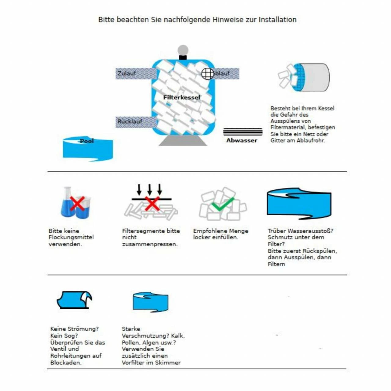 - schnelle Entsorgung – kein Abtransport bzw. Entsorgung und Endlagerung von schwerem Filtermaterial, kein mühsames Entfernen von verklumptem Filtersand