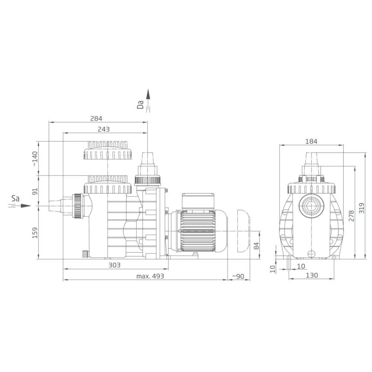 Schwimmbadwasser-Umwälzung in Filteranlagen, aufstellbar max. 2,0 m oberhalb oder max. 3,0 m unterhalb des Wasserniveaus.